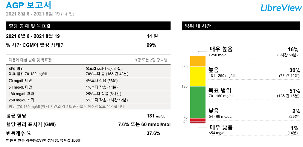 연속혈당측정기를 사용하고 있다면, AGP 보고서를 출력하여 결과를 저혈당이나 고혈당이 발견되는 시점에 대해 평가하고 음영으로 표시되는 (50% 또는 90% 범위의 값)부분에서 보이는 혈당 변동성에 대해 평가하고 이전 결과지와 비교해보고 공부하는 일련이 과정이 필요합니다.