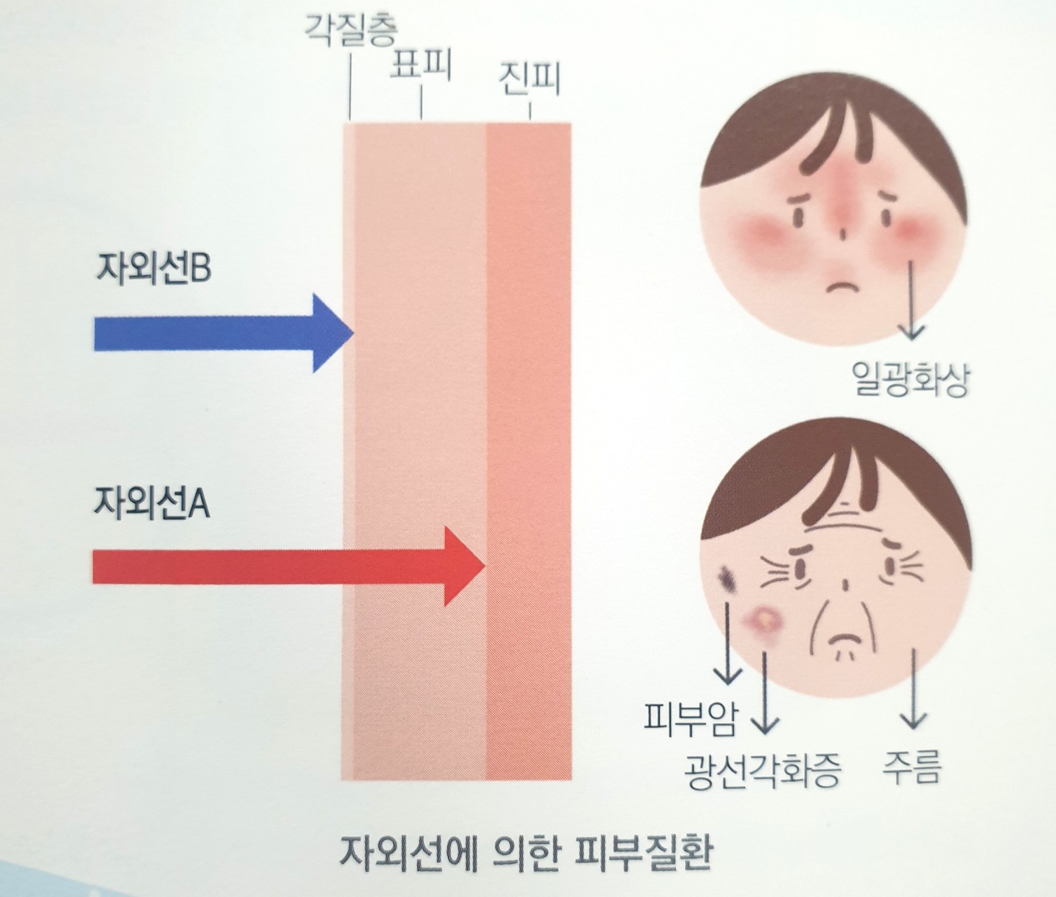 자외선에 자주 노출되면, 피부결이 거칠고, 건조해지고 피부 탄력이 감소하여 깊은 주름이 생기고, 피지샘이 과도하게 생기고, 모세혈관이 확장된다.