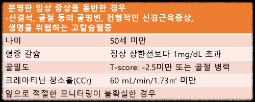 - 조절되지 않는 고칼슘혈증이 있으나 수술이 불가능한 경우 칼슘 수용체 작용제(cinacalcet) 투여 고려