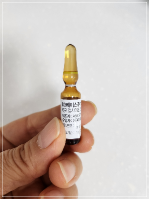 무색에서 녹색을 띤 노란색의 콜레칼시페롤 유액이 갈색 유리앰플에 든 주사제