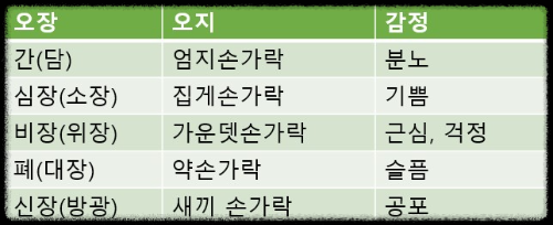 한의학에서는 다섯 개의 장부와 다서 손가락으를 상응기관으로 보고 간이 좋지 않을 때는 엄지 손가락을, 심장이 좋지 않을 때는 집게손가락을 다스렸다.
