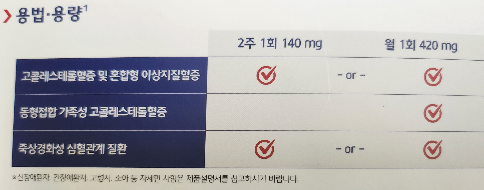 만 10세 이상의 원발성 고콜레스테롤혈증 및 혼합형 이상지질혈증: 2주 1회 140mg 또는 월 1회 420mg