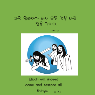“과연 엘리야가 와서 모든 것을 바로잡을 것이다. 내가 너희에게 말한다. 엘리야는 이미 왔지만, 사람들은 그를 알아보지 못하고 제멋대로 다루었다. 그처럼 사람의 아들도 그들에게 고난을 받을 것이다.”