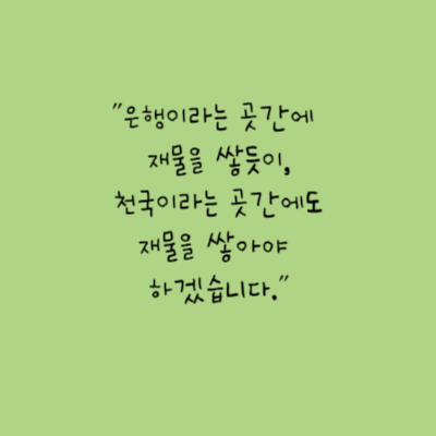 중요한 것은 재물의 많고 적음이 아닙니다. 부유할지라도, 가난할지라도 하느님의 영광을 위해서 사는 것입니다. 2월의 마지막 날입니다. 은행이라는 곳간에 재물을 쌓듯이, 천국이라는 곳간에도 재물을 쌓아야 하겠습니다.