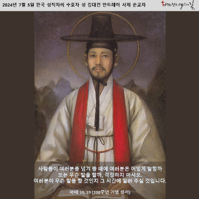 오늘 한국 교회 주교회의에서 순교자 현양을 위하여 과거에 대축일이었던 7월 5일에 한국 최초의 사제로서 한국 성직자들의 수호자 성 김대건 안드레아 사제 순교자를 기념하는 신심미사로 성대하게 드리기로 하였습니다.