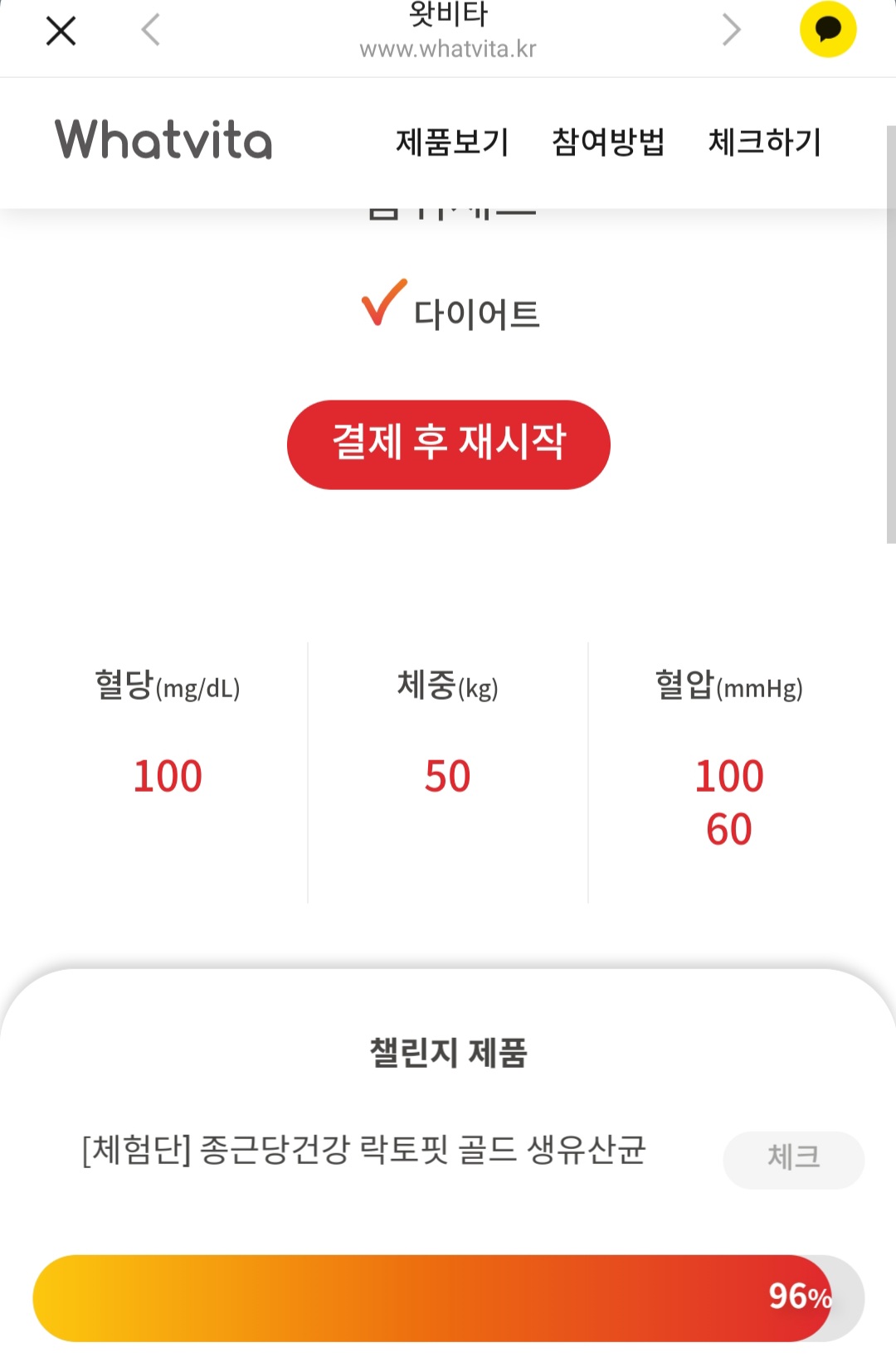 왓비타 챌린지는 왓비타에서 구매하신 영양제를 끝까지 섭취하게 도와드리는 프로그램입니다. 왓비타 챌린지를 통해 영양제를 구매하시고 매일 꾸준히 섭취하시고 90% 이상 체크 완료만 하면 다음 달 영양제가 '무료' 입니다. 특히 유산균같은 영양제는 무엇보다 꾸준히 먹어야