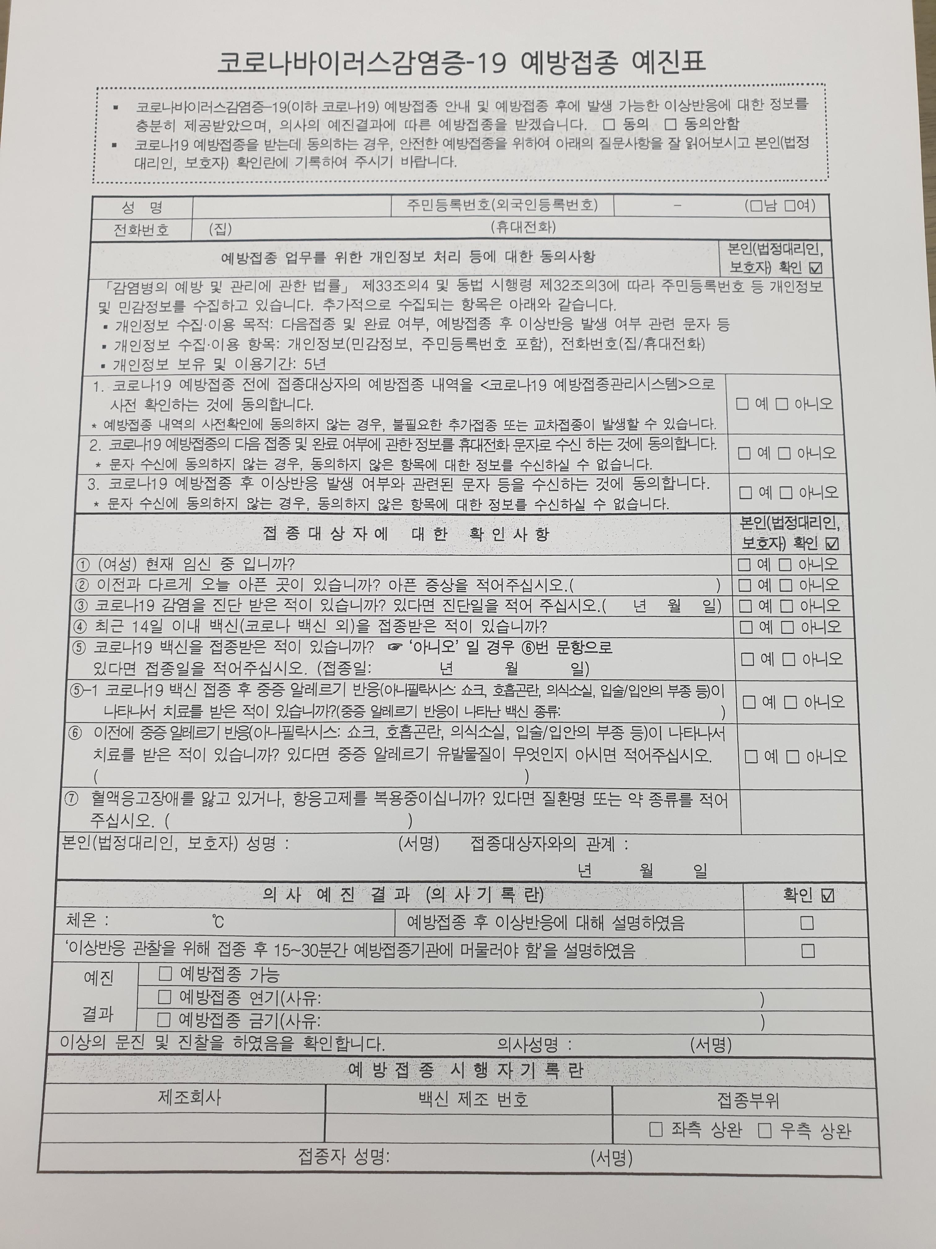 접종 대상자는 체온을 측정하고 가장 먼저 의료진의 안내에 따라 예진표를 작성하고 임신 알레르기 기저질환 여부와 복용중인 약물 여부를 기입해야 한다.