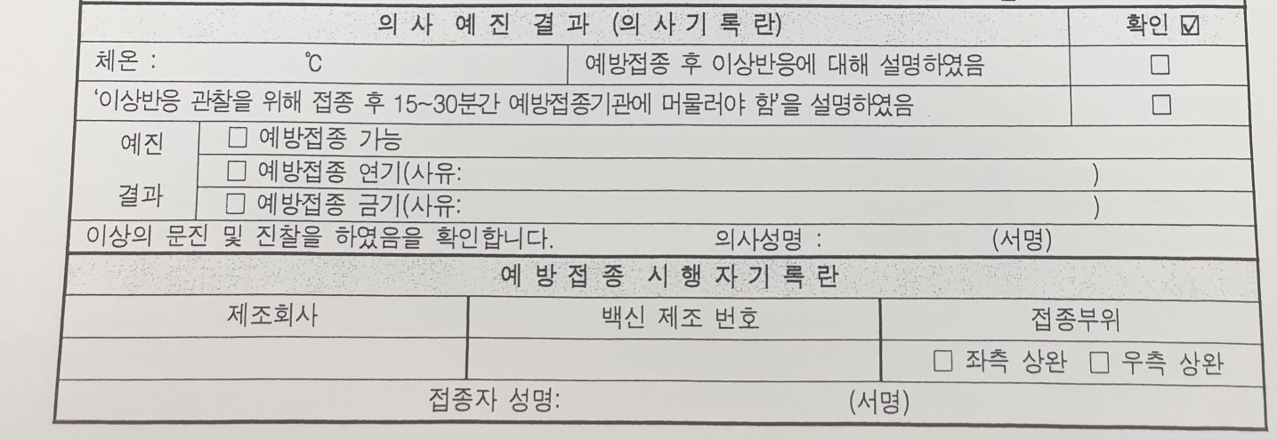 이후 실제 주사를 담당하는 의료진은 백신 제조회사와 제조번호, 어느 쪽 팔에 주사를 놓을 것인지를 기입하도록 되어 있다.
