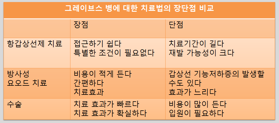 현재는 갑상선기능항진증의 치료는 항갑상선제 치료, 방사성요오드 치료, 수술등 방법이 있다. 각각의 방법은 모두 다른 장단점이 있다.